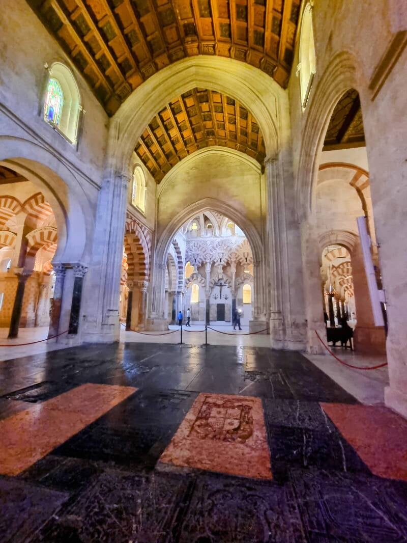 - Bosque de columnas: Más de 850 columnas de mármol, jaspe y granito, con arcos de herradura bicolores que crean un efecto hipnótico.