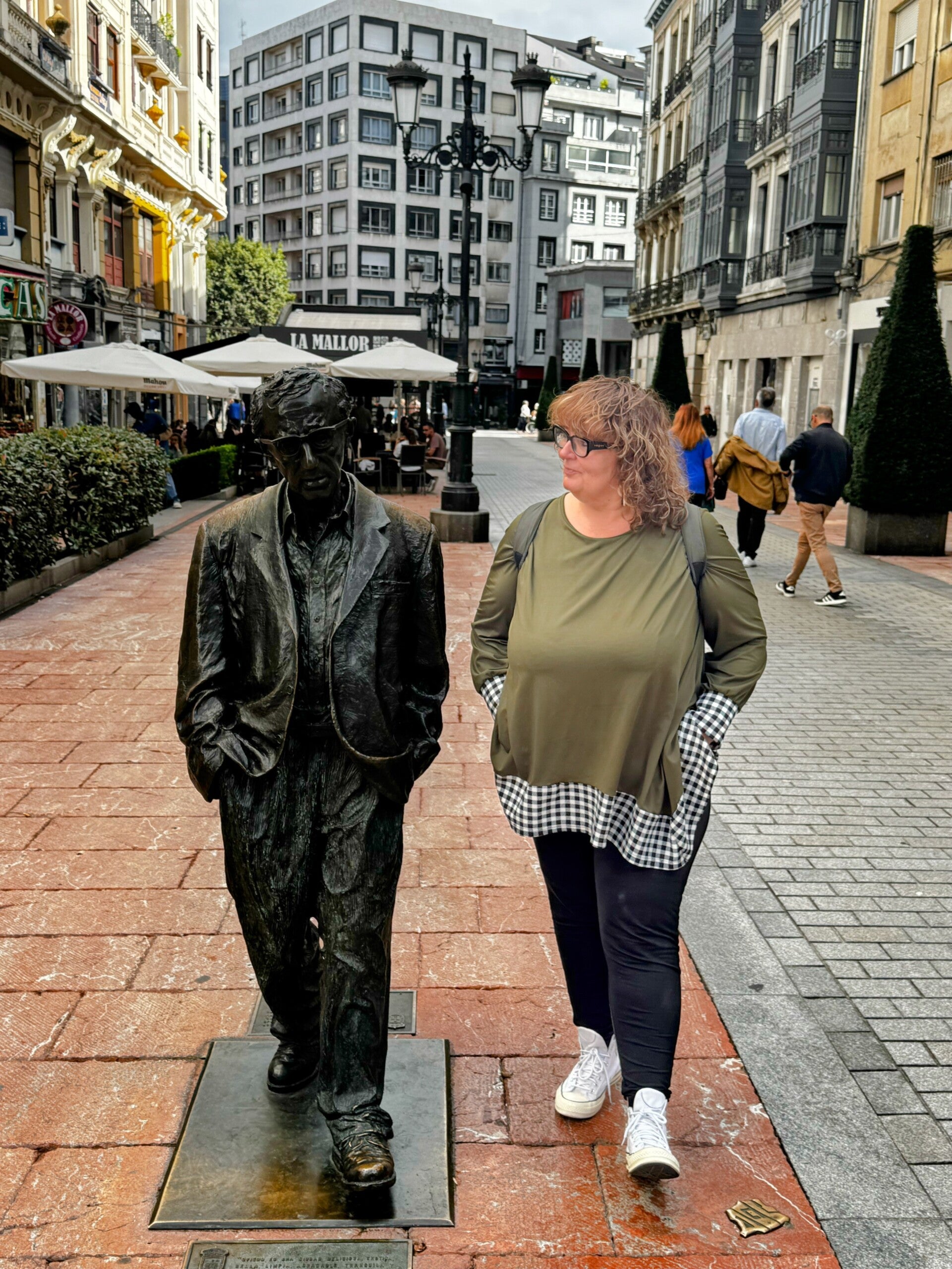 Mientras caminábamos bajo los soportales, escuchábamos el murmullo de la gente y el tintinear de las terrazas. Es una plaza que mezcla historia y cotidianeidad: aquí se celebra el mercado tradicional, pero también es el lugar donde los ovetenses se toman un vermut al sol sin prisa alguna.