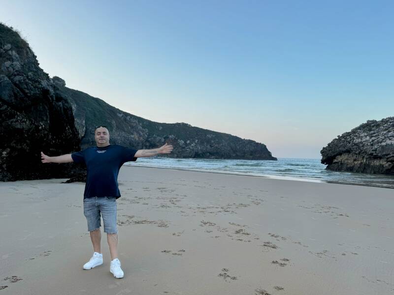 Cuando llegamos, lo primero que sorprende es que no se ve el mar. Caminamos por un sendero entre verdes praderas, y de repente, aparece ante nosotros un anfiteatro de arena dorada rodeado de roca caliza. El agua llega hasta aquí a través de un túnel subterráneo que conecta con el Cantábrico, formando una auténtica piscina natural que sube y baja con la marea.