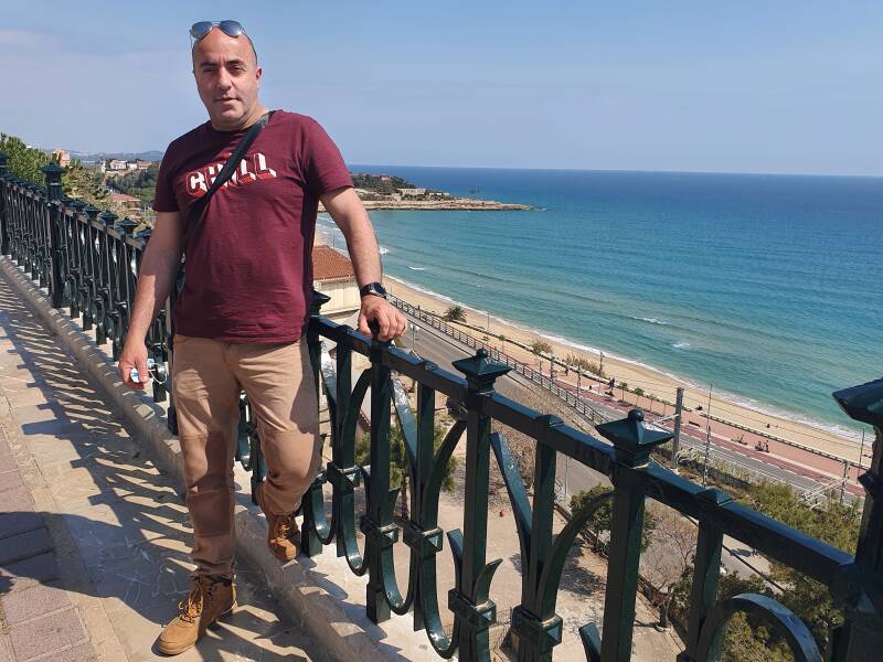 Apoyados en la barandilla de hierro forjado —a la que dicen que hay que tocar para tener buena suerte (pero de una forma especial😜), nos quedamos un buen rato contemplando el horizonte. A un lado, el anfiteatro romano se dibuja junto al mar; al otro, las playas de arena dorada parecen extenderse sin fin. El sonido de las olas llegaba hasta nosotros y nos regaló un momento de calma en mitad del recorrido por la ciudad.