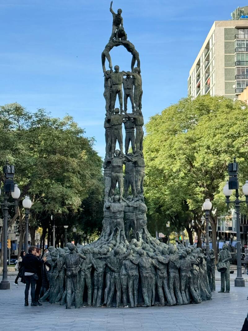 Nos encontramos con una escultura que captura la esencia de las torres humanas, con figuras que parecen estar en pleno equilibrio. Es un lugar muy fotogénico y, al mismo tiempo, nos conecta con una tradición local muy especial.