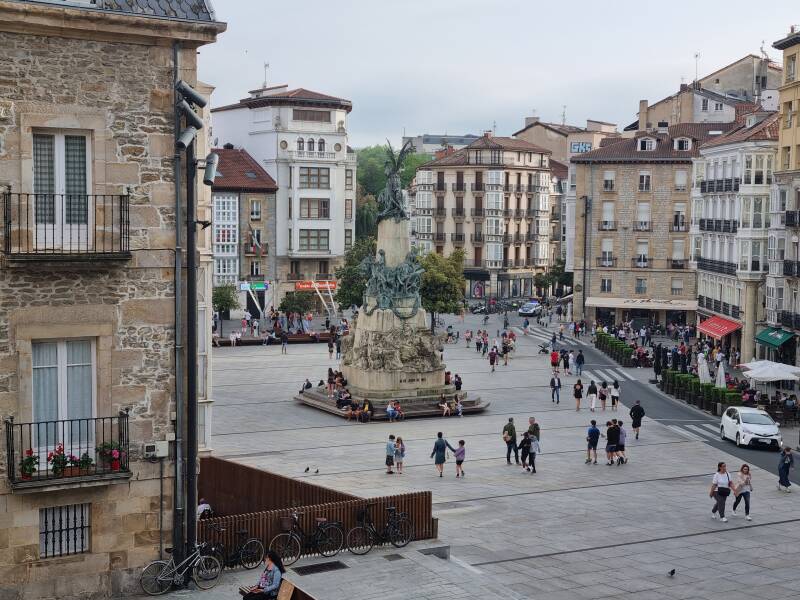 Nos fijamos en la estatua de la Virgen Blanca, que preside la plaza, y nos imaginamos las celebraciones y encuentros que aquí han tenido lugar a lo largo de los años. Entre paseos y fotos, nos dejamos llevar por la vida cotidiana, el bullicio de los cafés y la energía que desprende este rincón tan querido por los vitorianos.