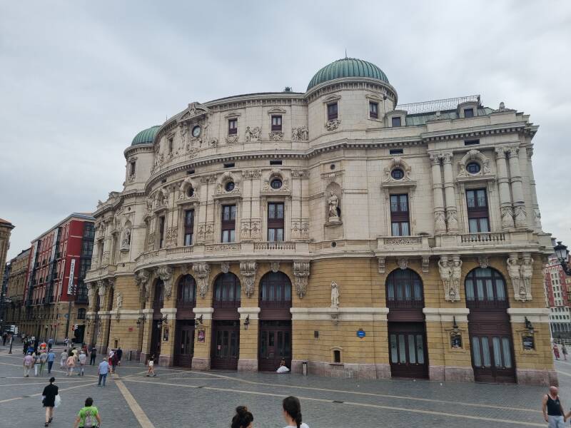 En nuestra ruta por Bilbao no pudimos dejar de detenernos frente al Teatro Arriaga, un edificio que parece sacado de otra época. Su fachada, elegante y majestuosa, nos atrapó de inmediato: grandes ventanales, balcones curvados y una arquitectura que respira romanticismo.