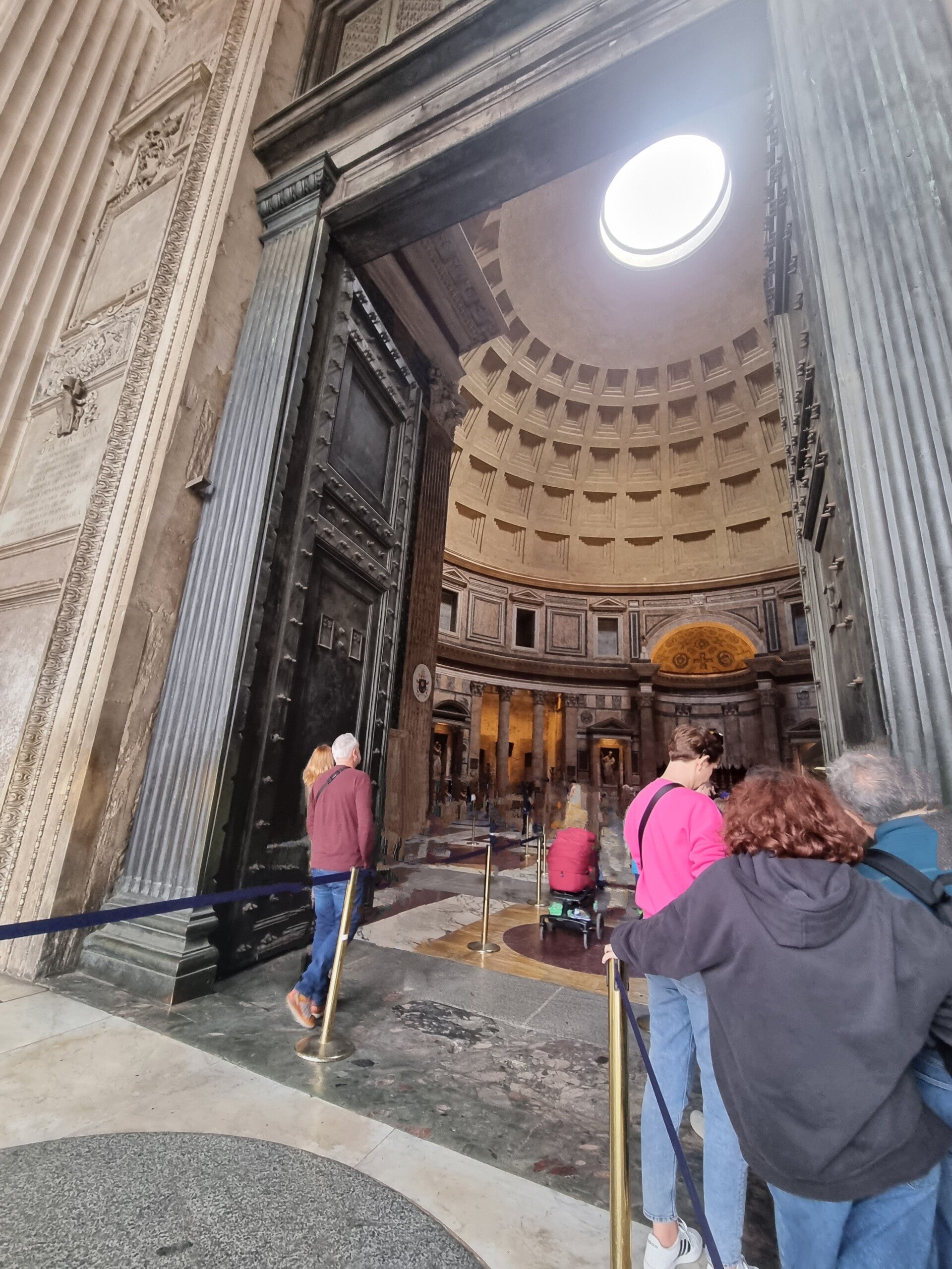 Al mirar hacia arriba, nos quedamos boquiabiertos ante la cúpula majestuosa con su oculus central, un enorme agujero que deja pasar la luz del cielo y crea un juego de luces que cambia a lo largo del día. Es increíble pensar que esta cúpula, construida hace casi dos mil años, sigue siendo la más grande de hormigón sin refuerzo del mundo.