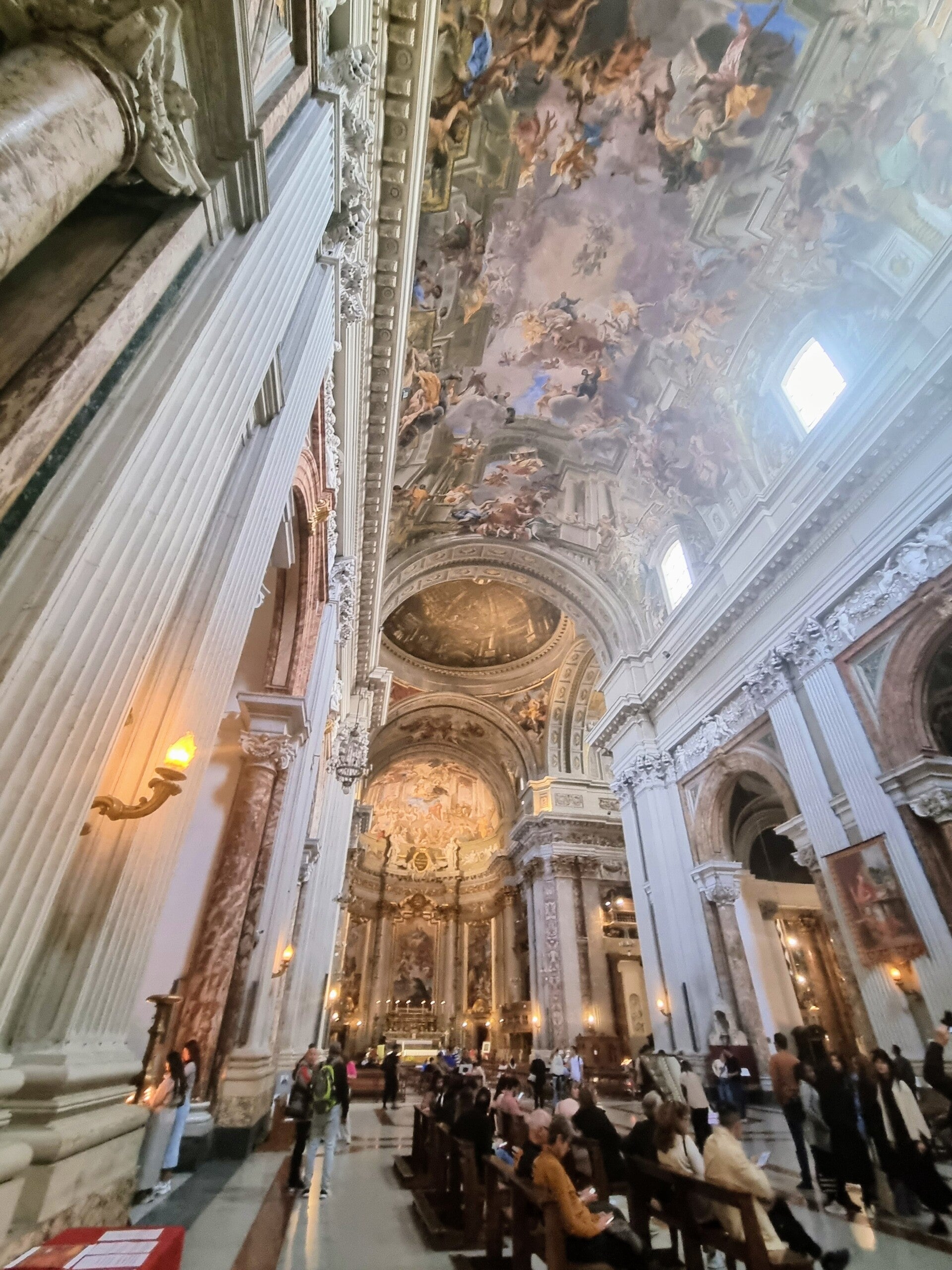Construida en el siglo XVII por la Compañía de Jesús, la iglesia está dedicada a San Ignacio de Loyola, fundador de la orden jesuita. Al entrar, nos sorprendió la grandiosidad de la nave central y la sensación de verticalidad que nos hace sentir pequeños ante tanta magnificencia. Pero lo que realmente nos maravilló fue el famoso techo pintado por Andrea Pozzo, una obra maestra de trampantojo que crea la ilusión de una cúpula que en realidad no existe. Desde nuestra posición en el suelo, parecía como si los santos y ángeles se elevaran hasta el cielo, flotando en un espacio infinito.