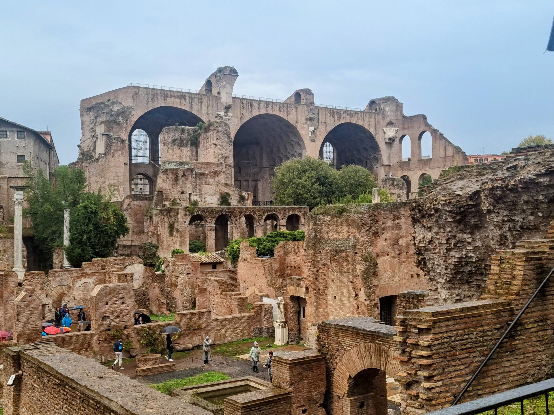 Uno de los rincones que más nos impresionó fue el Templo de Antonino y Faustina, convertido más tarde en iglesia, con su fachada perfectamente integrada en la historia viva de Roma. También nos maravilló la Basílica de Majencio y Constantino, cuyos restos transmiten una idea clara de la grandiosidad que debió tener el foro en su apogeo.