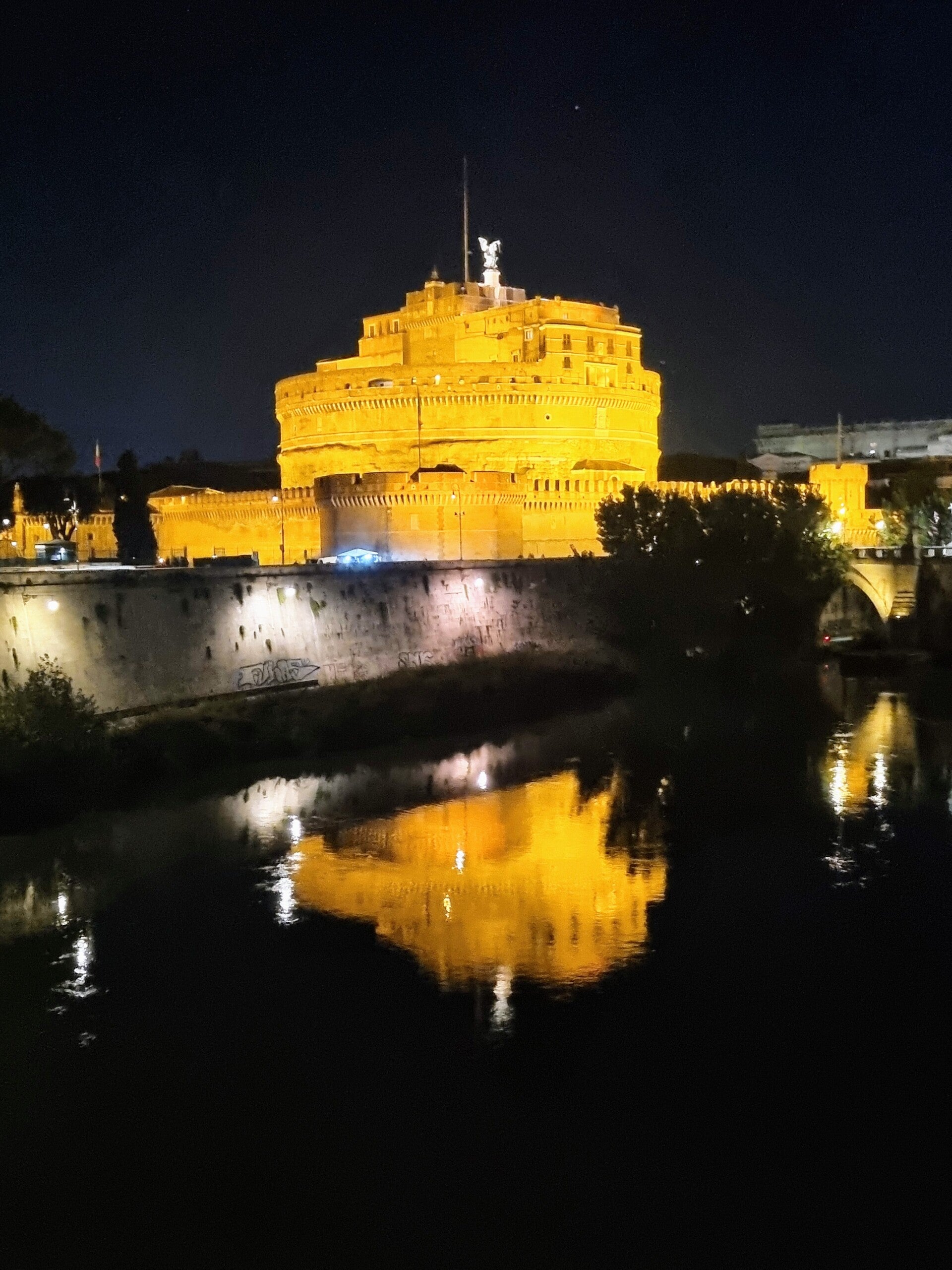 Al salir llegamos al imponente Castillo de Sant’Angelo, un edificio que, desde lejos, ya nos llamaba la atención con su forma circular y su presencia sobre el río Tíber. Al acercarnos, entendimos por qué ha sido uno de los símbolos de Roma durante casi dos mil años.